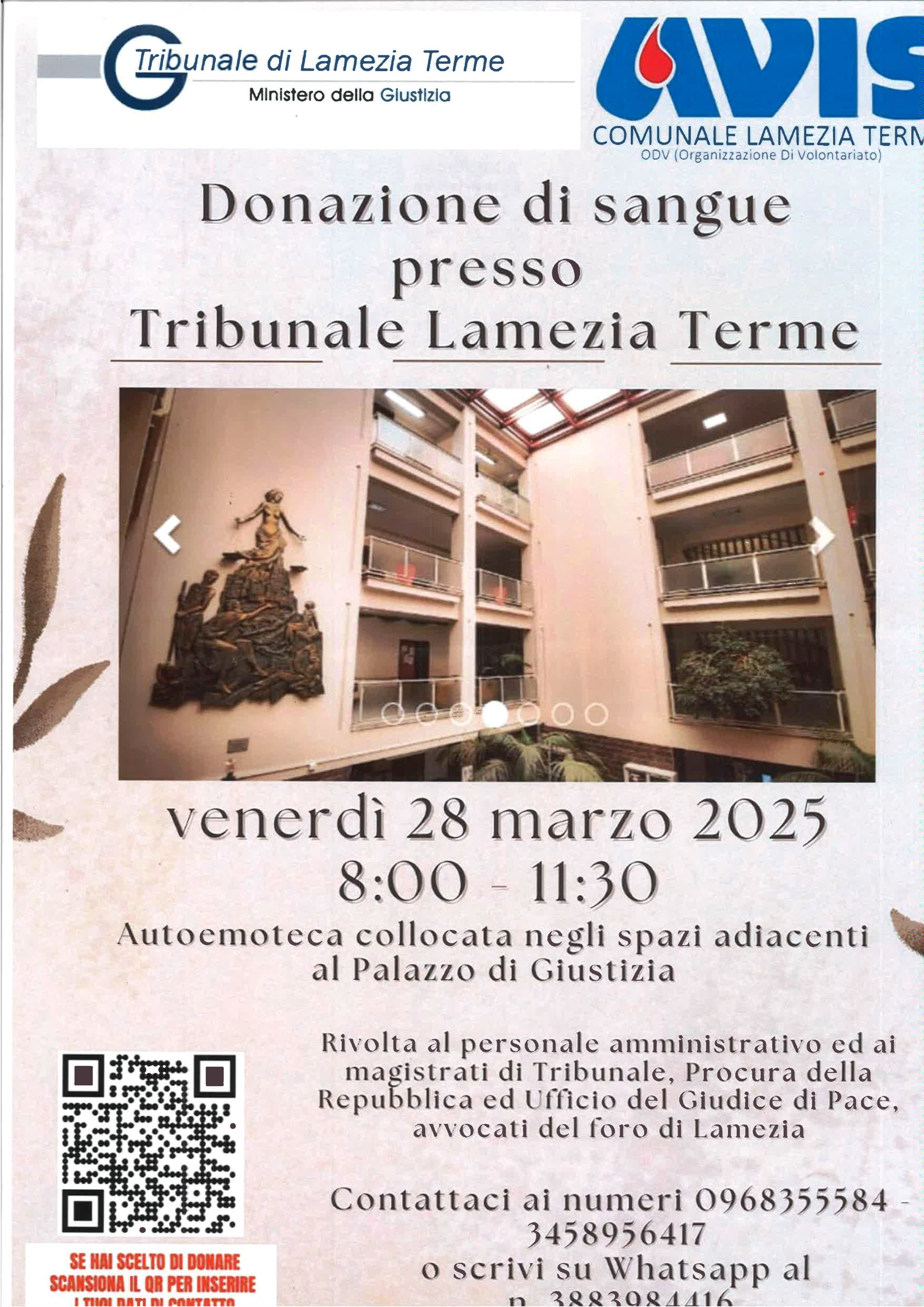Avis- Donazione di sangue al Tribunale di Lamezia Terme il 28 Marzo 2025 ore 11:30